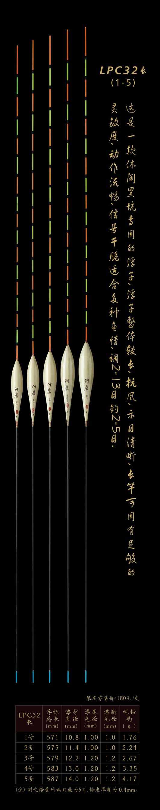 LPC32長:是一款休閑黑坑專用的浮子,浮子整體較長,抗風(fēng),示目清晰,長竿可用有足夠的靈敏度,動(dòng)作流暢,信號干脆適合多種魚情,調(diào)2—13目,釣2-5目。