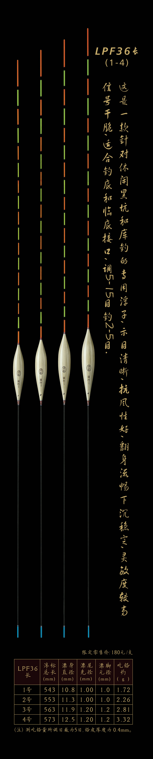 LPF36長:這是一款針對休閑黑坑和庫釣的專用浮子,示目清晰,抗風(fēng)性好,翻身流暢下沉穩(wěn)定,靈敏度較高信號干脆,適合釣底和臨底接口,調(diào)5—15目,釣2—5目.